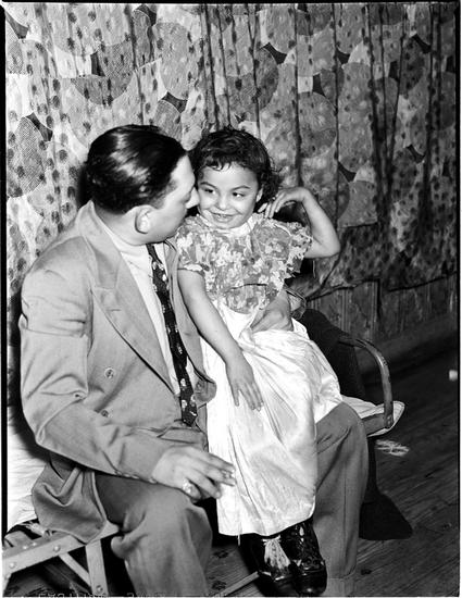 [Girl with man dressed as Santa Claus at a Christmas celebration.]