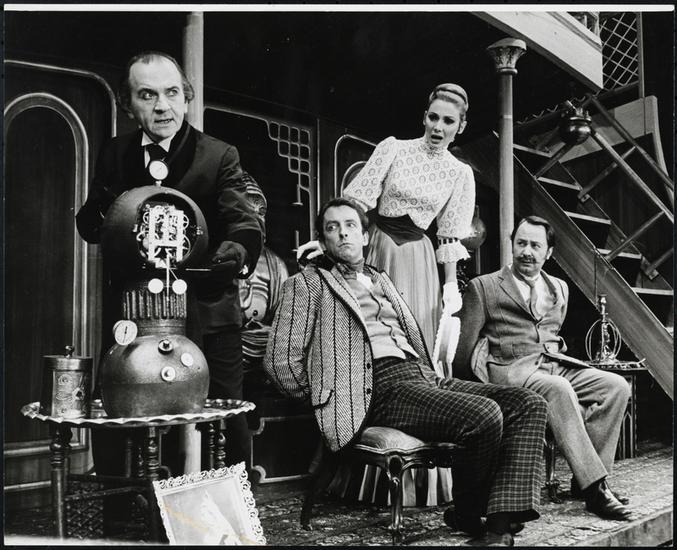 [Fritz Weaver as Sherlock Holmes, Martin Gabel as Professor Moriarty and Inga Swenson as Irene Adler in "Baker Street".]