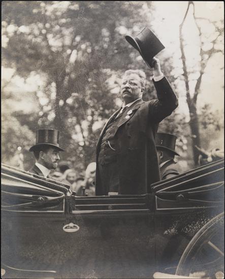 [Teddy Roosevelt waves to the crowd at a parade in his honor.]