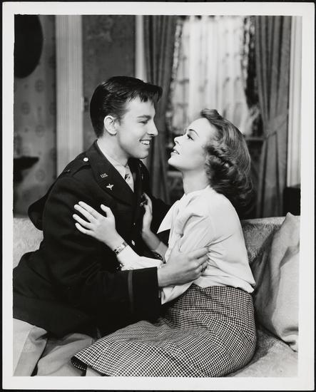 [Lois Wheeler as Ruth Wilkins, William Talman as Lt. William Seawright and Leona Powers as Mrs. Edith Wilkins in "Dear Ruth".]
