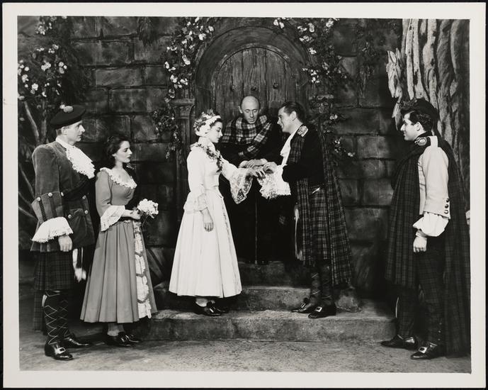 [George Keane as Jeff Douglas, David Brooks as Tommy Albright and William Hansen as Mr. Lundie in "Brigadoon".]