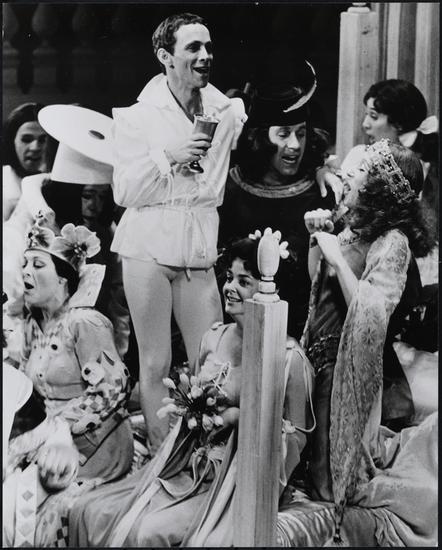 [Joel Grey as Master of Ceremonies with the Kit Kat Girls in "Cabaret".]
