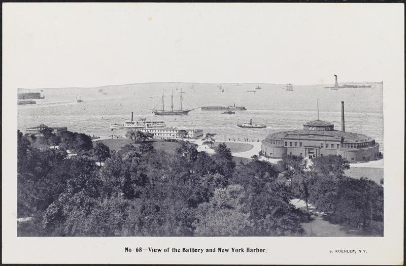 New York from The Battery. Showing Statue of Liberty and Ellis Island.