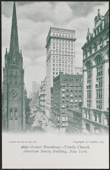 Trinity Church, Lower Broadway, and American Surety Building, New York.