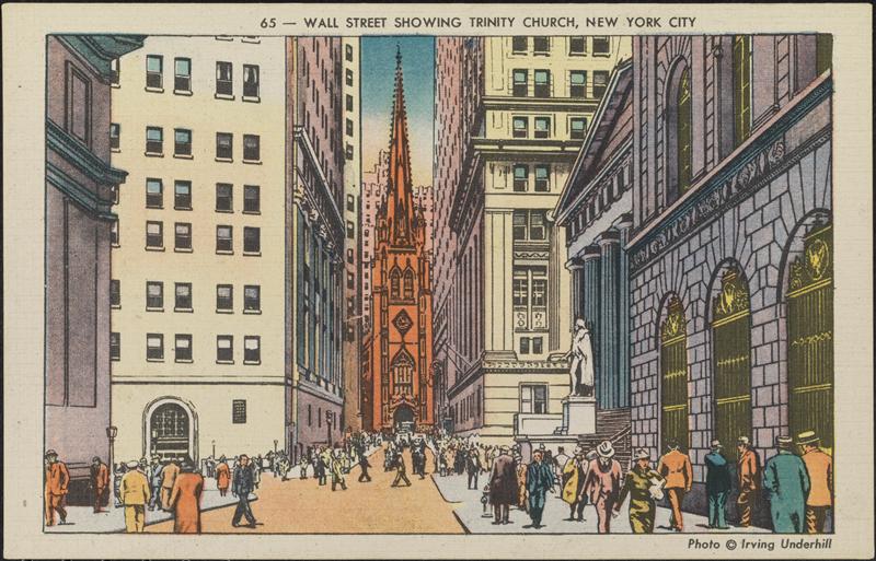 Wall Street Showing Stock Exchange, Sub - Treasury and Trinity Church, New York.