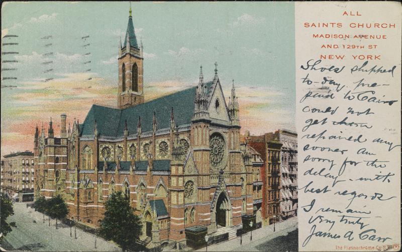 Madison Avenue at the corner of 129th Street. All Saints Roman Catholic Church, school.