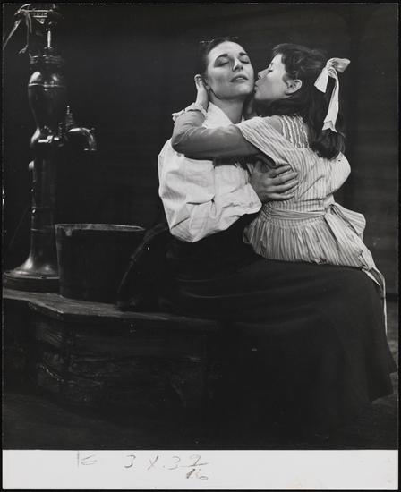 [Anne Bancroft as Annie Sullivan and Patty Duke as Hellen Keller in "The Miracle Worker".]