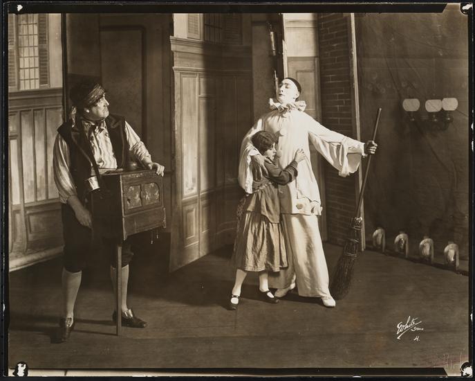 [Elsie MacKay as Marie Duplessis, John Roche as The Young Man, George Ryan as Master Charles and Lionel Atwill as Jean-Gaspard Deburau in "Deburau".]