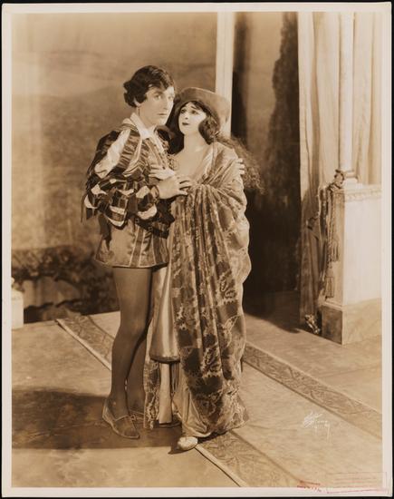 [Julia Adler as Jessica and Horace Braham as Lorenzo in the balcony scene of "The Merchant of Venice".]