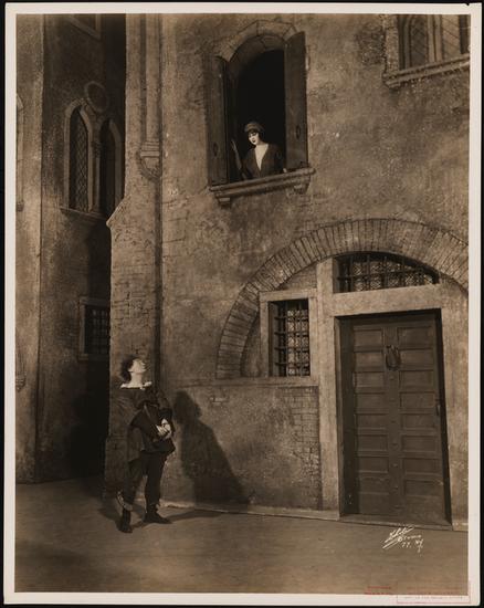 [Julia Adler as Jessica and Horace Braham as Lorenzo in the balcony scene of "The Merchant of Venice".]