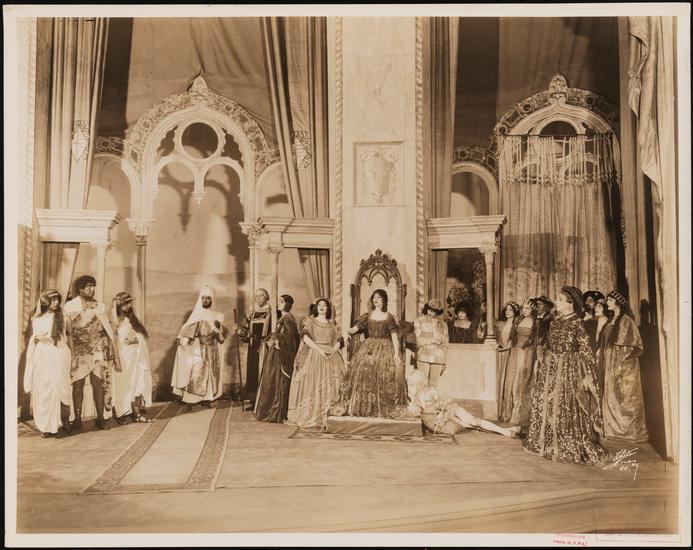 [Julia Adler as Jessica and Horace Braham as Lorenzo in the balcony scene of "The Merchant of Venice".]