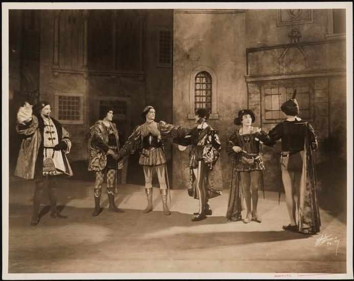 [Julia Adler as Jessica and Horace Braham as Lorenzo in the balcony scene of "The Merchant of Venice".]