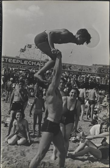 [Group of teenage boys performing stunt on Coney Island beach.]