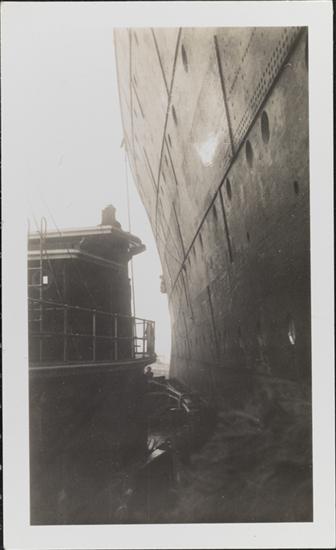[Ship next to tugboat.]