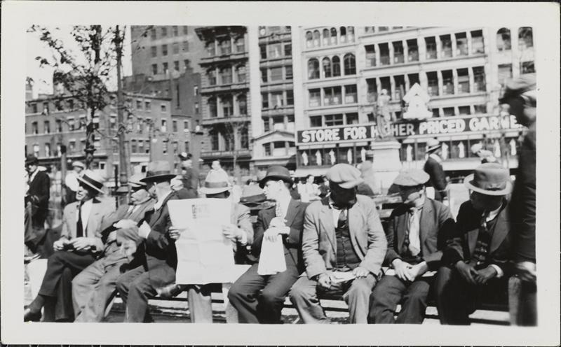 [Men gathered in Union Square.]