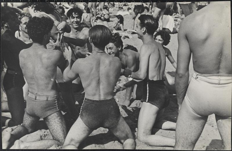 [Group of teenage boys performing stunt on Coney Island beach.]
