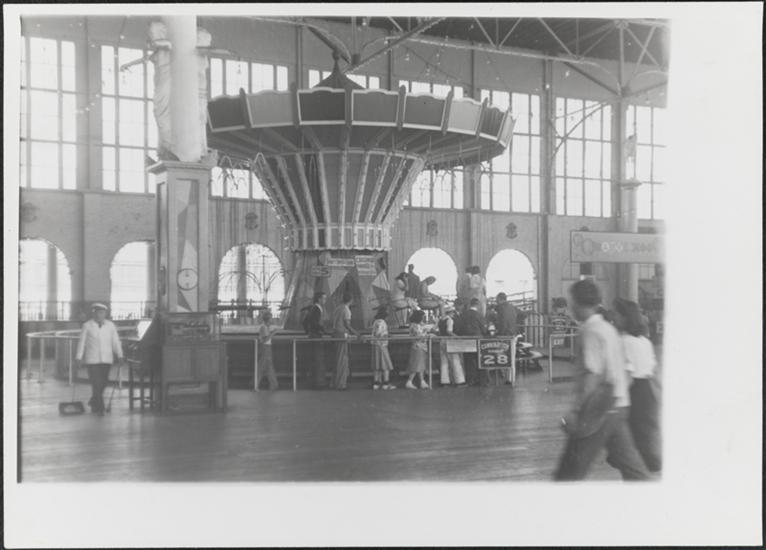 [Children on indoor swing carousel at Coney Island amusement park.]