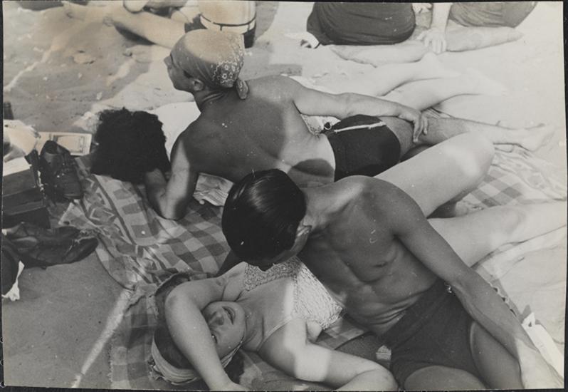 [Couple sunbathing at Coney Island beach.]