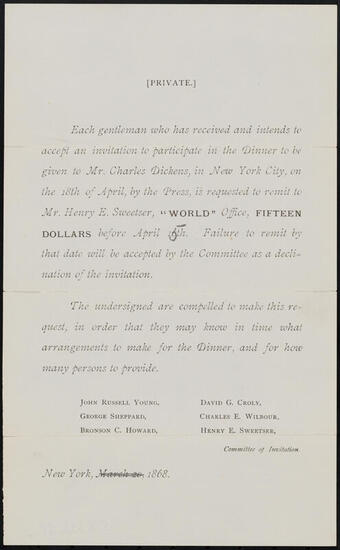 [Invitation to complimentary dinner to Charles Dickens given by the Press of the United States on April 18, 1868.]