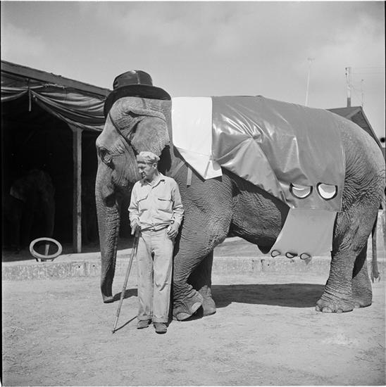 Circus [Ringmaster, with elephants and trainer in the background.]