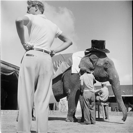 Circus [Circus elephants walking in a ring, with an ringmaster in the middle.]