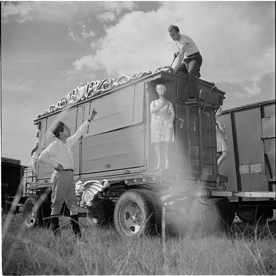 Circus [Men drinking soda outside Barnum and Bailey railroad cars.]