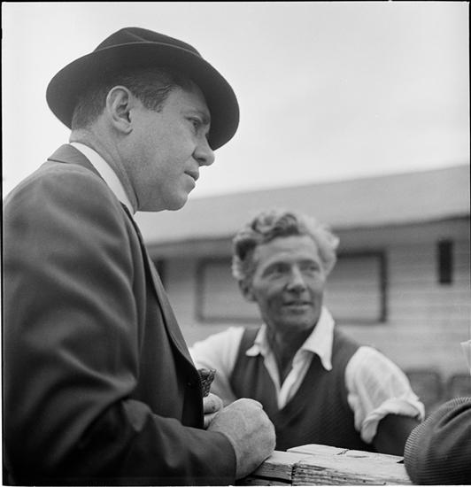 Circus [Men drinking soda outside Barnum and Bailey railroad cars.]