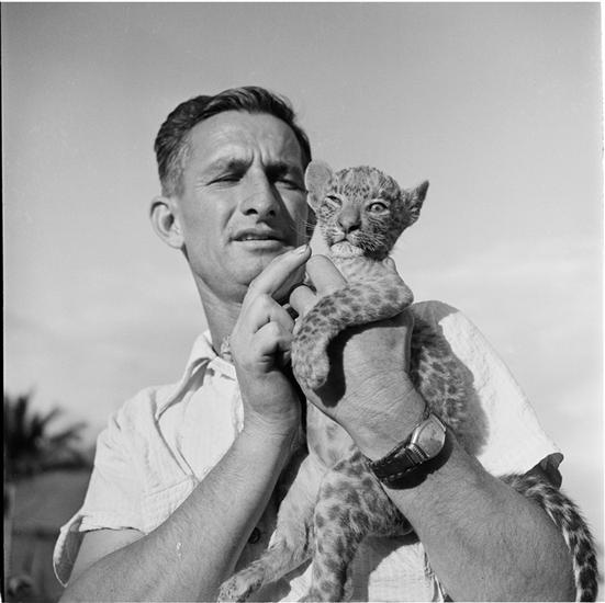 Circus [Trainer showing a cheetah cub to a group of women.]
