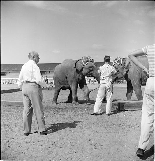 Circus [Ringmaster, with elephants and trainer in the background.]