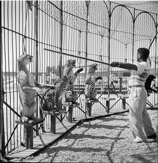Circus [Ringmaster, with elephants and trainer in the background.]