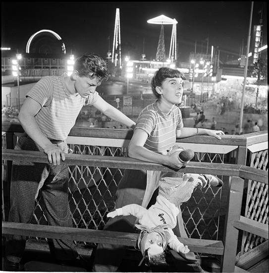 Palisades Amusement Park [Man and woman in the park, woman holds a doll upside down.]