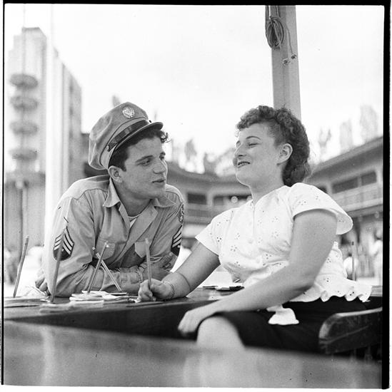 Palisades Amusement Park [Man and woman talking in an amusement park.]