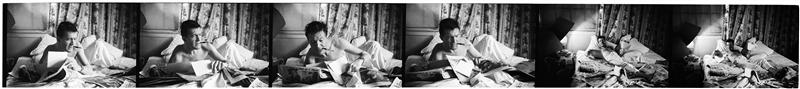 Peter Arno [Arno, in bed, looking through newspapers.]