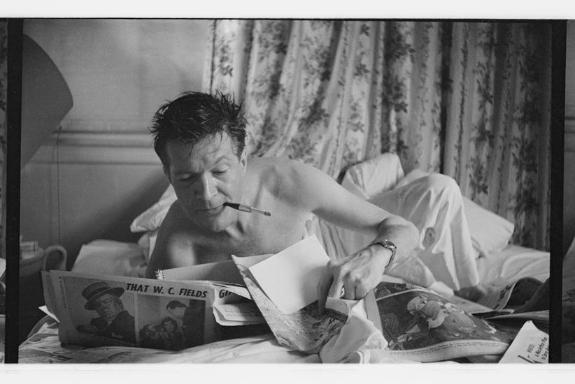 Peter Arno [Arno, in bed, surrounded by newspapers.]