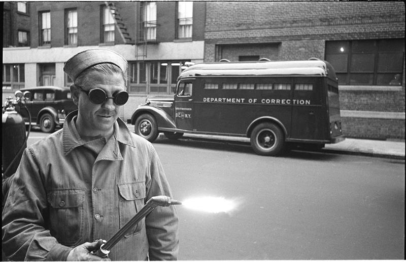Paddy Wagon [Man with welding equipment used in the making of the television show Paddy Wagon.]