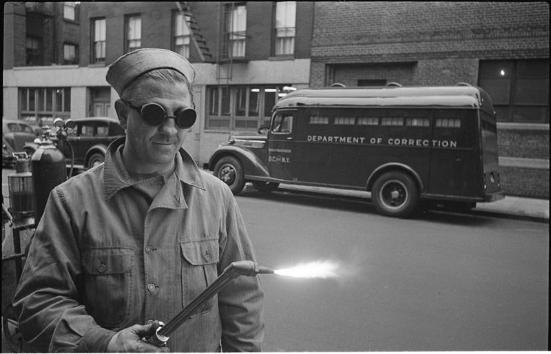 Paddy Wagon [Man with welding equipment used in the making of the television show Paddy Wagon.]