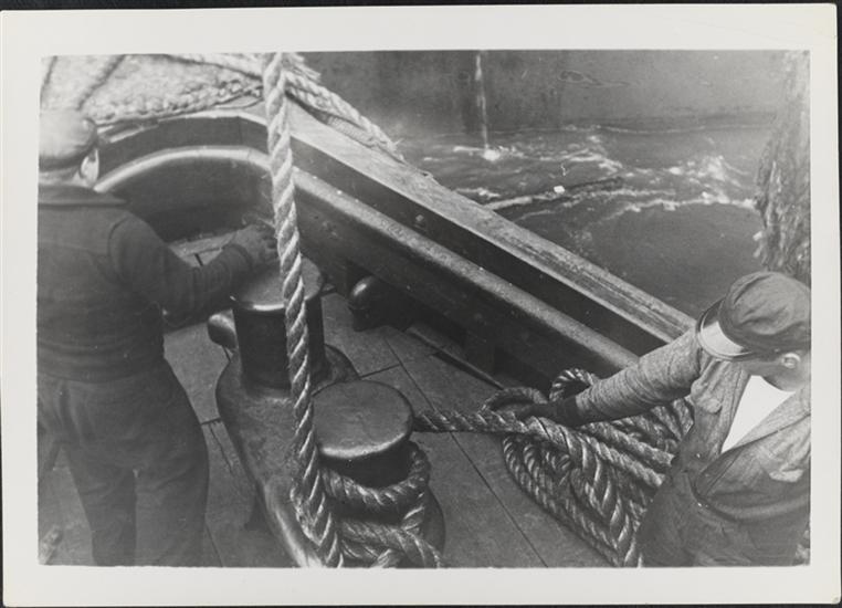 [Man securing rope around snubbing post.]