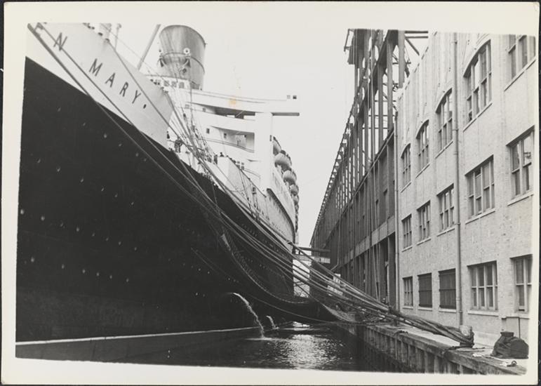 [Queen Mary ship in harbor.]