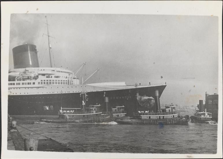 [Normandie ship with tugboats.]