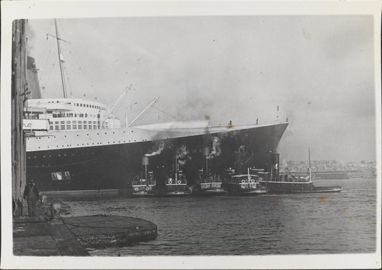 [Normandie ship with tugboats.]