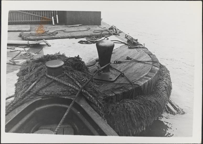[Man throwing rope from Marion Moran tugboat to snubbing post.]