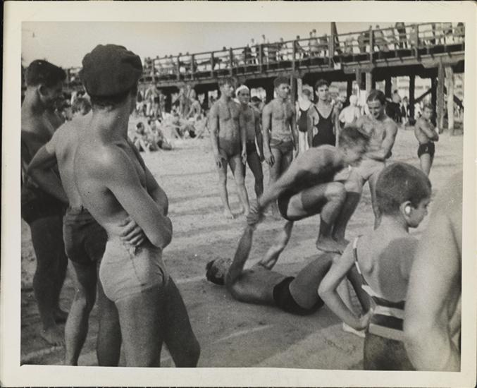 [Group of teenage boys performing stunt on Coney Island beach.]