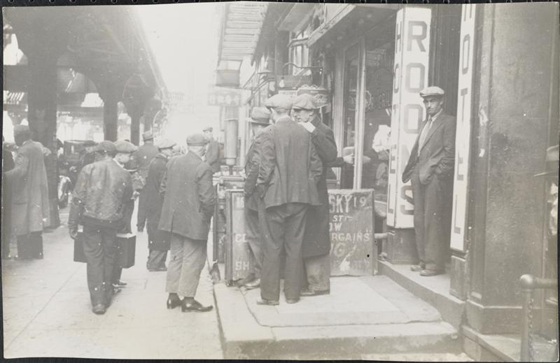 [Destitute men hanging out in front of flophouse on the Bowery.]