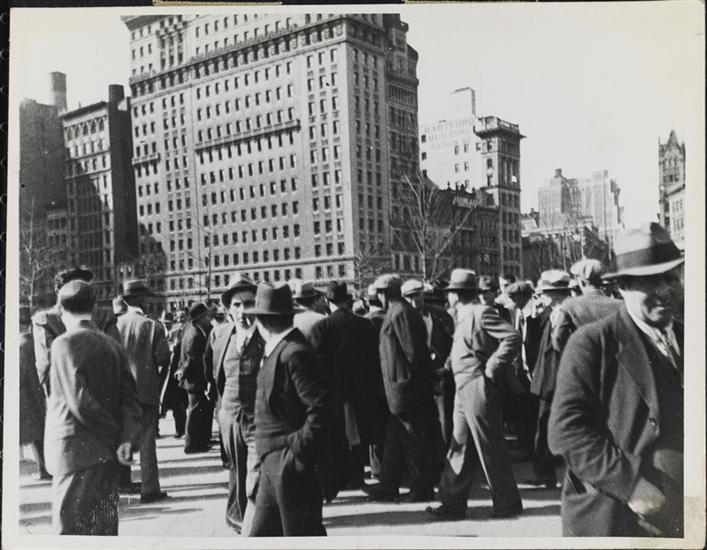 [Destitute men sleeping in front of George Washington statue at Union Square.]