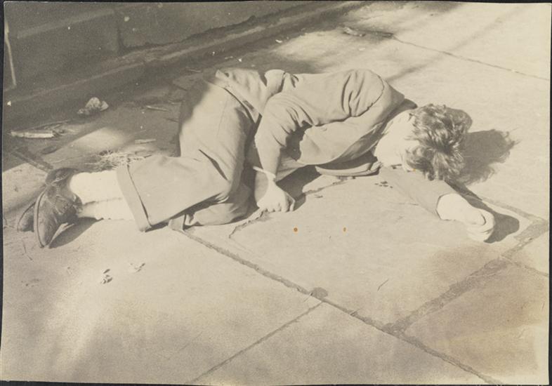 [Destitute man sleeping on East River pier with Brooklyn skyline visible.]