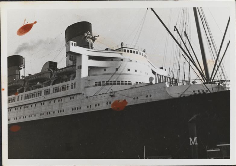 [Moran tugboat guiding RMS Aquitania to dock.]