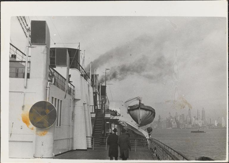 [Men hanging out on deck of ship with view of Manhattan skyline.]