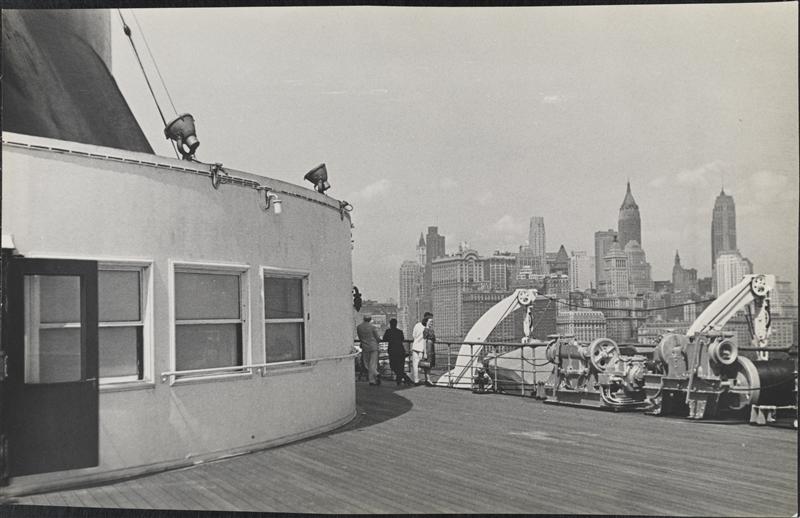 [Men hanging out on deck of ship with view of Manhattan skyline.]