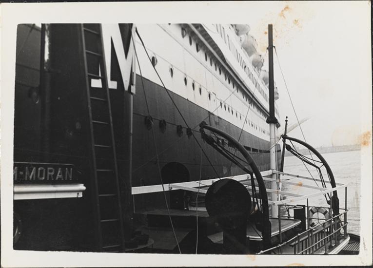[Moran tugboat with Queen Mary ship.]
