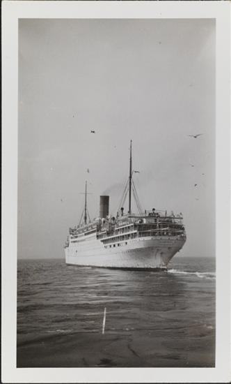 [Moran tugboat guiding RMS Aquitania to dock.]